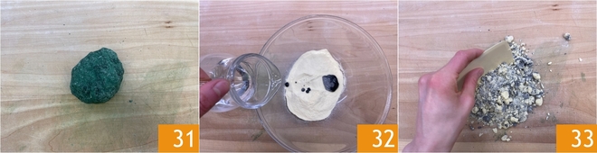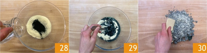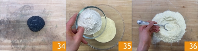 Você deve obter uma massa compacta 31; não importa se não está homogênea, pois a sêmola é mais resistente. Envolva-a em filme plástico e deixe descansar 30 minutos na geladeira. Passe para a massa preta: em uma tigela, coloque a sêmola, a tinta de lula e a água 32. Proceda da mesma forma, misturando primeiro com uma colher e depois à mão sobre a bancada 33.