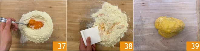 Coloque as gemas no centro 37 e amasse 38 até obter uma massa homogênea 39. Envolva-a em filme plástico e deixe descansar na geladeira por 30 minutos.