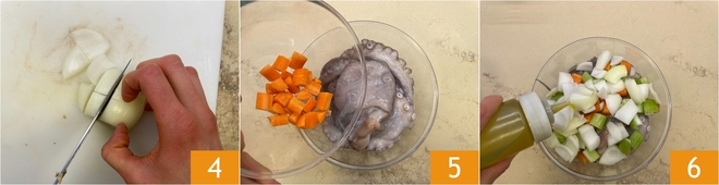 Limpe e corte grosseiramente também a cebola 4. Coloque o polvo limpo em uma tigela, adicione os legumes 5 e tempere com o azeite 6 e o sal, massageando bem com as mãos para dar sabor.