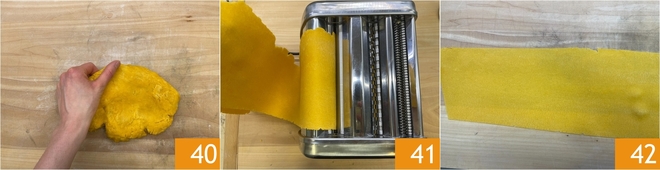 Recupere a massa de ovo e achate-a ligeiramente 40, depois passe-a nos rolos da máquina de massa 41: polvilhe com a sêmola e comece com a espessura mais grossa até chegar à mais fina (deve-se ver a sombra da mão através da massa) 42. Cubra as folhas com um pano para não secarem.