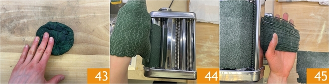 Estenda a massa de spirulina: achate o pedaço de massa 43, passe-o nos rolos da máquina até a penúltima espessura 44, depois corte em tagliolini usando o rolo apropriado 45.