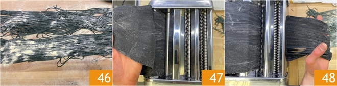 Polvilhe os tagliolini com a sêmola e reserve 46. Por fim, passe também a massa preta até a penúltima espessura 47 e depois corte em tagliatelle com a máquina 48.