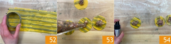Monte os raviolis: vire a folha tricolor e corte discos com um cortador de massa liso de 7 cm de diâmetro 52. Recheie o centro dos discos de massa com o recheio de peixe 53, depois borrife as bordas com água 54.
