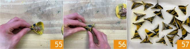 Dobre a massa 55 de forma a fazer coincidir a borda em 3 pontos, como formando uma hélice 56. Coloque os raviolis em uma bandeja forrada com papel vegetal 57.