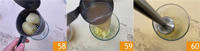 Por fim, prepare o molho aveludado: cozinhe as batatas por cerca de 30 minutos, ou até ficarem macias, depois reduza-as a um purê com o esmagador de batatas 58. Adicione ao purê 700 g do fundo de cozimento de mexilhões, amêijoas e polvo 59, ou o quanto baste para obter uma consistência lisa. Bata com o mixer de imersão 60.