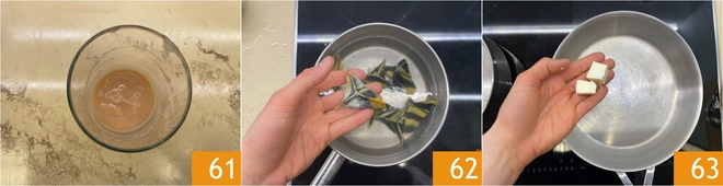 O molho aveludado está pronto 61, aqueça-o em uma panela, levando-o à fervura, pouco antes de servir. Agora cozinhe os raviolis em água fervente com sal 62 e, enquanto isso, derreta a manteiga em uma frigideira grande 63.