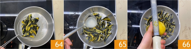 Quando os raviolis subirem à superfície (levará alguns minutos), escorra-os 64 e transfira-os para a frigideira. Salteie delicadamente os raviolis na manteiga, alongando com uma concha de água de cozimento 65, depois perfume com raspas de limão 66.