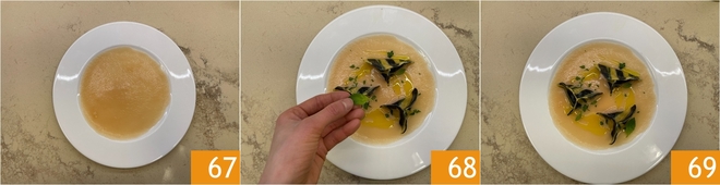 Coloque o molho aveludado de batatas na base do prato 67, depois disponha os raviolis e decore com salsa picada e folhas de manjericão 68. Os raviolis de peixe com três massas estão prontos para serem servidos 69!