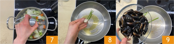 Aqueça uma panela grande, transfira o polvo e os legumes para dentro e, com um movimento rápido, cubra com a tampa 7. Cozinhe por 30 minutos em fogo baixo. Depois, deixe descansar por mais 30 minutos com o fogo desligado e a tampa fechada. Enquanto isso, prepare os mexilhões: em uma panela, aqueça o azeite com o alho e as hastes de salsa 8, depois adicione os mexilhões limpos 9 e a água.