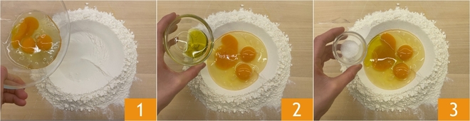 Para preparar os raviolis de ricota e ervas com molho de nozes, comece com a massa fresca: despeje a farinha sobre uma superfície, faça um buraco no meio e adicione os ovos 1, o óleo 2 e o sal 3.