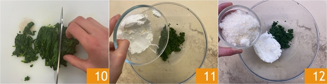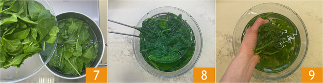 Enquanto isso, prepare o recheio: limpe as ervas mistas e escalde-as por 3-4 minutos em água fervente com sal 7. Escorra as ervas em água com gelo 8, depois esprema bem para eliminar o excesso de água 9.