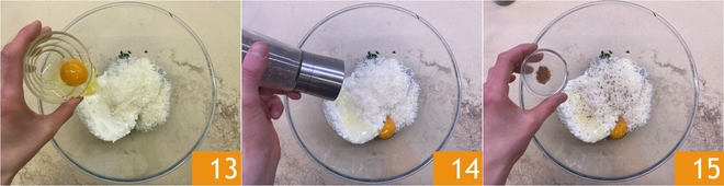 Adicione também o ovo 13, o sal, a pimenta 14 e a noz-moscada 15.