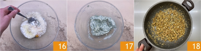 Misture bem 16 para obter uma mistura homogênea 17. Se ficar muito mole, você pode adicionar um pouco mais de queijo ralado. Transfira o recheio para um saco de confeitar sem bico para maior comodidade e reserve. Passe para o molho de nozes: toste as nozes em uma frigideira antiaderente por 2-3 minutos 18, depois deixe esfriar.