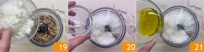 Transfira as nozes para um mixer, reservando algumas para a apresentação, depois adicione o queijo parmesão ralado 19, o meio dente de alho 20 e o óleo 21.