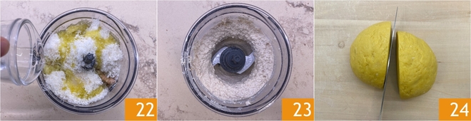 Adicione sal, pimenta e um pouco de água 22. Bata até obter uma consistência cremosa e homogênea 23, depois reserve. Agora retire a massa da geladeira e divida ao meio com um raspador 24.