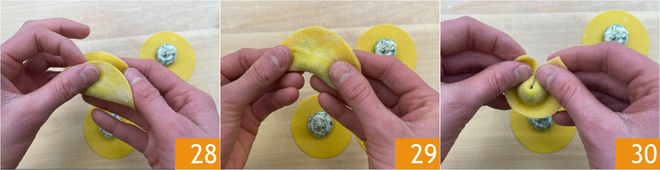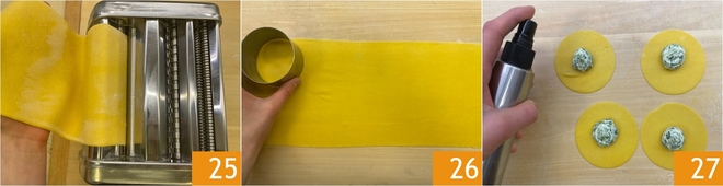 Amasse e enfarinhe levemente a primeira porção de massa, depois abra com a ajuda de uma máquina de macarrão, começando pela espessura mais larga 25; você deve chegar a uma espessura de 2 mm. Prossiga da mesma forma com a segunda porção de massa, em seguida, corte discos com um cortador de massa de 7,5 cm de diâmetro 26. Você pode amassar novamente as sobras e abri-las depois de deixar o bloco descansar. Pressione uma porção de recheio no centro de cada disco, depois umedeça as bordas com água 27.