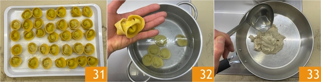 Aos poucos, coloque os raviolis em uma bandeja polvilhada com farinha 31. Você está pronto para cozinhar: leve uma panela de água salgada para ferver e cozinhe os raviolis por 3-5 minutos 32. Enquanto isso, despeje o molho de nozes em uma frigideira e adicione uma concha da água do cozimento 33.