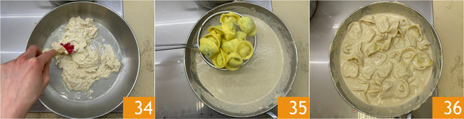 Misture bem para obter um molho cremoso 34, depois escorra os raviolis aqui 35 e misture tudo com o fogo desligado 36.