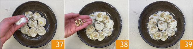 Emprate os raviolis e finalize com queijo parmesão ralado 37 e as nozes tostadas reservadas 38. Seus raviolis de ricota e ervas com molho de nozes estão prontos para serem servidos 39!