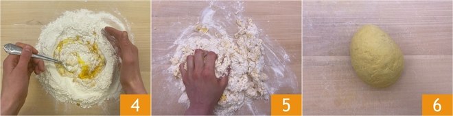 Comece a misturar com um garfo para incorporar a farinha aos poucos 4, depois continue a trabalhar com as mãos 5 até obter uma massa lisa e homogênea 6. Envolva o bloco de massa em filme plástico e deixe descansar na geladeira por 30 minutos.