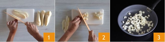 Para preparar os raviolis de trigo-sarraceno com peras e taleggio, comece preparando o recheio dos raviolis: descasque uma pera, retire o miolo e corte-a primeiro em tiras 1 e depois em cubos bem pequenos 2. Coloque os cubos de pera em uma frigideira antiaderente 3 e cozinhe por 5 minutos, mexendo frequentemente.
