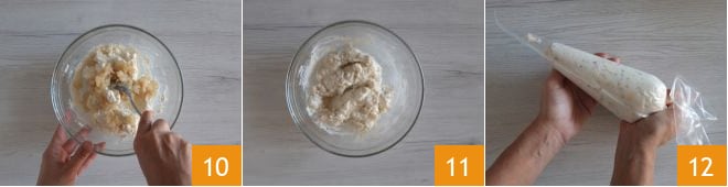 Tempere a mistura com pimenta-do-reino 10 e sal fino, depois misture bem para integrar os ingredientes. Por fim, adicione as peras 11 e misture. Coloque o recheio em um saco de confeitar e guarde na geladeira até o momento de usá-lo 12.
