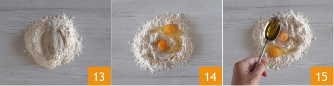 Passe para a preparação dos raviolis: despeje as duas farinhas em forma de fonte sobre uma superfície 13; adicione os ovos 14, sal fino, azeite de oliva extra virgem 15 e, com um garfo, bata levemente os ovos.