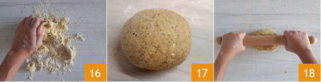 Trabalhe com as mãos 16 até obter uma massa lisa e homogênea 17. Passe para a formação dos raviolis: enfarinhe a superfície e abra a massa com um rolo 18, até obter uma folha bem fina.