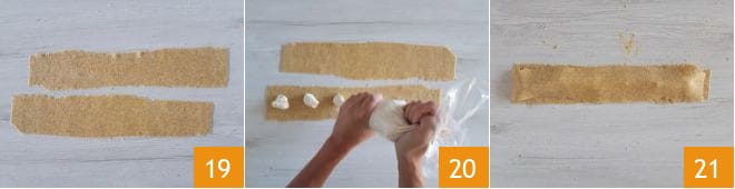 Corte tiras de massa com cerca de 8 centímetros de largura 19. Pegue o recheio dos raviolis da geladeira; corte a ponta do saco de confeitar e, em uma folha de massa, disponha montinhos de recheio, espaçados entre si 20. Cubra com uma tira de massa 21.