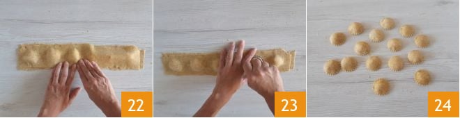 Pressione levemente ao redor do recheio para unir as duas folhas e para remover o excesso de ar, evitando assim que os raviolis se abram durante o cozimento 22. Com um cortador redondo com borda serrilhada de 6 cm de diâmetro, corte os raviolis 23. Continue da mesma forma até esgotar todos os ingredientes 24. Com essas quantidades, você obterá cerca de 24 raviolis.