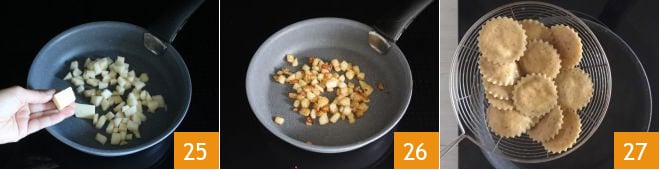 Passe para a preparação das peras caramelizadas para o molho: descasque e corte a pera em cubos como feito anteriormente; coloque-os em uma frigideira, adicione a pimenta e 10 g de manteiga 25. Cozinhe, em fogo médio, até que os cubos de pera fiquem caramelizados, mexendo frequentemente. Demorará cerca de 4 minutos 26. Enquanto isso, coloque no fogo uma panela com bastante água salgada e quando ferver, cozinhe os raviolis por cerca de 5 minutos 27.