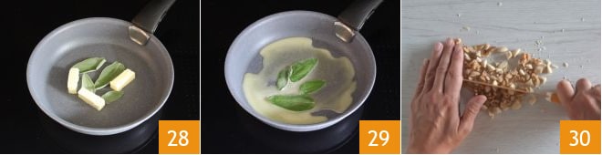 Enquanto isso, coloque 3-4 folhas de sálvia e os 70 g de manteiga restantes em uma frigideira 28 antiaderente. Derreta completamente a manteiga, sem deixar ferver 29. Pique grosseiramente as frutas secas 30.