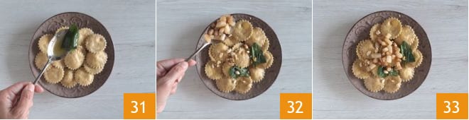 Escorra os raviolis e tempere com manteiga e sálvia 31, as frutas secas picadas e os cubos de pera caramelizados 32. Sirva imediatamente os raviolis de trigo-sarraceno com peras e taleggio 33.