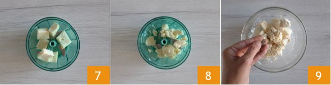 Coloque-o em um mixer 7 e triture grosseiramente 8. Adicione o taleggio à ricota 9.
