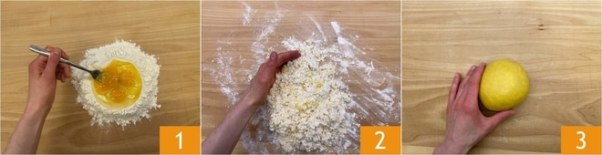 Para preparar os raviolis de carne, primeiro disponha a farinha em forma de vulcão, colocando os ovos no centro. Incorpore lentamente a farinha com um garfo 1 e depois amasse 2 até obter uma massa lisa e homogênea 3. Envolva com filme plástico e deixe descansar em um local fresco e seco por 30 minutos.
