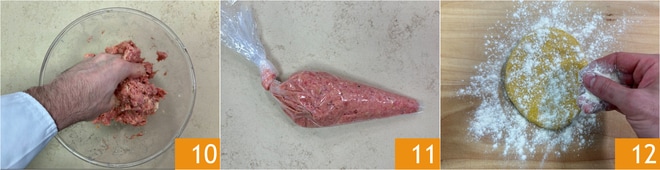 Trabalhe com as mãos até obter uma mistura homogênea 10, depois transfira para um saco de confeiteiro 11. Pegue a massa novamente e enfarinhe-a 12.