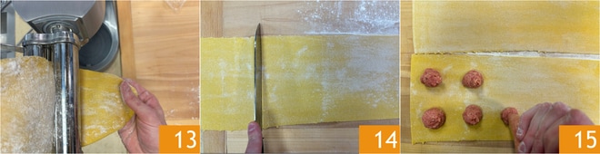 Abra a massa com uma máquina de macarrão 13 ou com um rolo, até atingir uma espessura de cerca de 1-2 mm. Divida ao meio 14, pincele uma das partes com água, depois disponha pequenas porções de recheio a uma distância de 3-4 cm uma da outra 15.