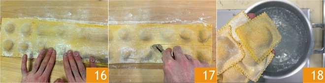 Sobreponha a outra parte da massa, fazendo coincidir as bordas, depois com as mãos elimine o ar ao redor do recheio 16 e adira bem as duas massas. Com uma carretilha, corte as bordas, corte e obtenha raviolis quadrados de cerca de 4 cm de lado 17. Cozinhe os raviolis em água fervente e salgada 18 por 3-4 minutos ou até que subam à superfície.