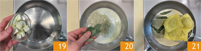 Em uma frigideira, derreta a manteiga 19 em fogo médio, adicione a sálvia 20 e deixe saborizar até que a manteiga fique dourada e a sálvia crocante. Escorra os raviolis e transfira-os para a frigideira 21. Salteie delicadamente por 1 minuto.