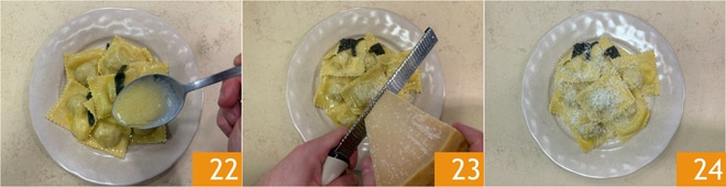 Emprate os raviolis, adicione uma colher de manteiga derretida 22 e finalize com uma pitada de Parmesão ralado 23. Os seus raviolis de carne estão prontos para serem saboreados 24!