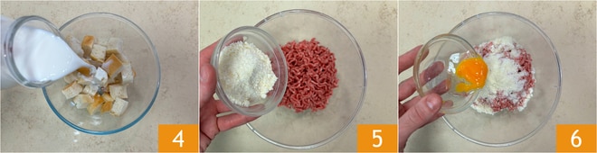 Enquanto isso, dedique-se ao recheio: mergulhe o pão amanhecido no leite 4. Em outra tigela, misture a carne moída de boi e de porco. Adicione o Parmesão 5 e o ovo 6.