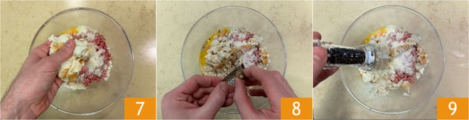 Adicione também o pão bem espremido 7, a noz-moscada 8, sal e pimenta 9.
