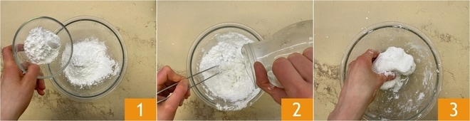 Para preparar os raviolis de cristal, comece pela massa: em uma tigela, coloque o amido de trigo e o amido de milho 1. Misture os pós com os hashis (ou uma colher), depois despeje a água fervente em fio 2. Uma vez absorvida toda a água, sove à mão 3.