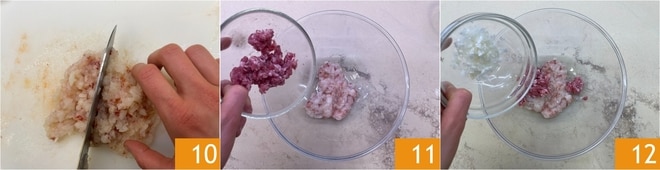 Você deve obter uma picadinha muito fina 10. Transfira os camarões para uma tigela, depois adicione a carne moída de porco 11 e meia cebolinha picada 12.