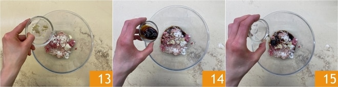 Agora tempere com o gengibre ralado 13, o molho de soja, o molho de ostras 14 e o óleo de gergelim 15.