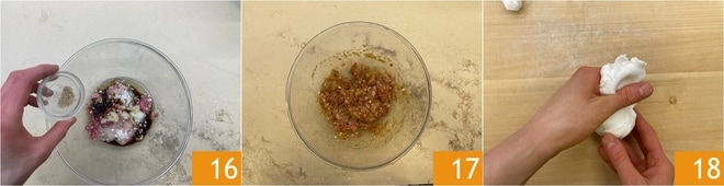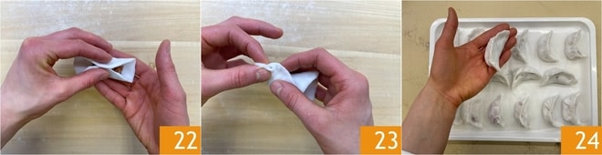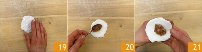 Abra a bolinha de massa fazendo uma leve pressão com a lateral da palma da mão: o disco deve ficar mais fino na borda, assim a parte central, mais espessa, não se romperá durante o cozimento. Solte o disco da superfície de trabalho com a ajuda de um raspador, depois recheie o centro com uma colher de chá do recheio 20. Feche ao meio, unindo as duas extremidades 21.