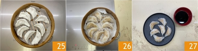 Prepare a cesta para cozimento a vapor, forre com uma folha de papel manteiga que você terá perfurado com pequenos furos e coloque aqui os raviolis 25. Feche com a tampa apropriada e cozinhe por 8-10 minutos 26. Sirva seus raviolis de cristal acompanhados com molho de soja 27!