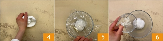 Transfira a massa para uma superfície e continue a sovar até que fique lisa e elástica; esta etapa requer muita energia, pois a massa é bastante resistente 4. Forme um bloco, coloque-o na tigela e cubra com filme plástico 5. Deixe descansar por 5 minutos, depois incorpore a banha, que dará mais elasticidade à massa 6.