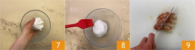 Forme novamente um bloco, coloque-o na tigela 7 e pincele a superfície com óleo de gergelim para mantê-lo hidratado 8. Cubra com filme plástico e reserve enquanto prepara o recheio. Pique os camarões limpos com uma faca 9.
