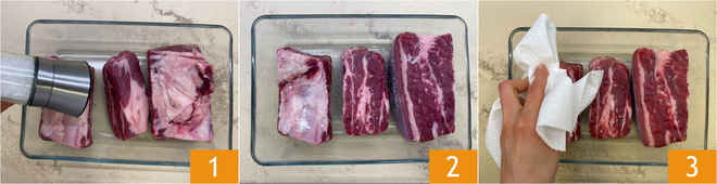 Para preparar o ravioli recheado de costelas de boi com espuma de limão, comece pela carne do recheio: cubra as costelas de boi com sal de todos os lados 1, depois deixe-as descansar descobertas e em temperatura ambiente por algumas horas 2. Após esse tempo, seque bem a carne com papel absorvente para secá-la 3.